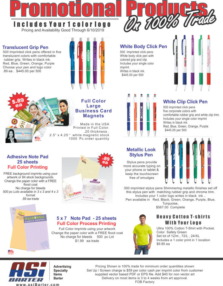 Each month ASI Barter brings together 100% trade offers from the various promotional products factories we work with .